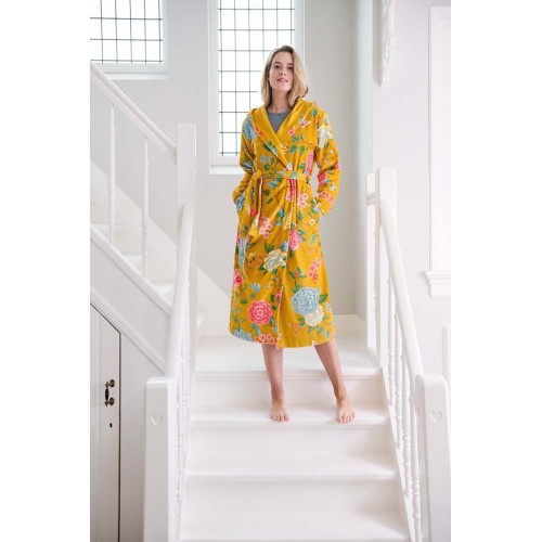 Švelnus veliūrinis chalatas Proho Good Evening su gobtuvu, šoninėmis kišenėmis ir ilgu surišamu diržu sukurtas jaukiam poilsiui. Dideli spalvingų gėlių motyvai suteikia chalatui dekoratyvumo ir išraiškingo charakterio. Audinys yra šiltas, tačiau pralaidus orui, todėl puikiai tinka tiek ramiems vakarams po vonios, tiek lėtam rytinės kavos ritualui. Chalatas pasiūtas iš 100 % aukštos kokybės medvilnės kilpinio veliūro (380 g/m²), kuris pasižymi minkštumu, švelniu blizgesiu ir subtiliu prabangos pojūčiu. Medžiaga gerai išlaiko formą ir spalvą net ir po daugelio skalbimų. Prieš naudojimą rekomenduojama chalatą išskalbti, laikantis priežiūros nurodymų etiketėje.