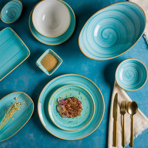 Aura Aqua kolekcija išsiskiria gyvybingais atspalviais, kurie lengvai prisitaiko prie skirtingo interjero ir patiekalų pateikimo stiliaus. Spiralinis dekoras, primenantis nuolat judančią visatą, simbolizuoja tęstinumą, o sodrios spalvos suteikia serviravimui energijos ir gyvumo.