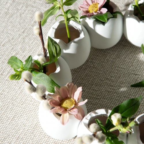 Dekoratyvinis kiaušinių vainikėlis – žaisminga Velykų puošmena. Kiaušinių formos dekoracijos gali būti naudojamos kaip mažos vazelės pavasarinėms gėlytėms, todėl vainikėlis taps originaliu stalo ar kompozicijos akcentu.