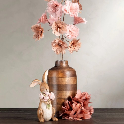 Tai elegantiška ir jauki Velykinė dekoracija, spinduliuojanti ramybę bei pavasarišką šilumą. Subtiliai užmerktos zuikio akys ir lengvai palenktos ausys suteikia jam svajingą, pavasarišką nuotaiką. Glėbyje laikoma tulpių puokštė tampa harmoningu akcentu, įnešančiu gaivos ir pavasarinės nuotaikos.