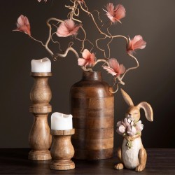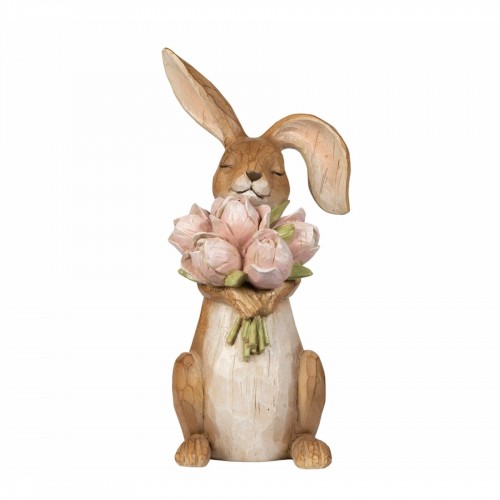 Tai elegantiška ir jauki Velykinė dekoracija, spinduliuojanti ramybę bei pavasarišką šilumą. Subtiliai užmerktos zuikio akys ir lengvai palenktos ausys suteikia jam svajingą, pavasarišką nuotaiką. Glėbyje laikoma tulpių puokštė tampa harmoningu akcentu, įnešančiu gaivos ir pavasarinės nuotaikos.