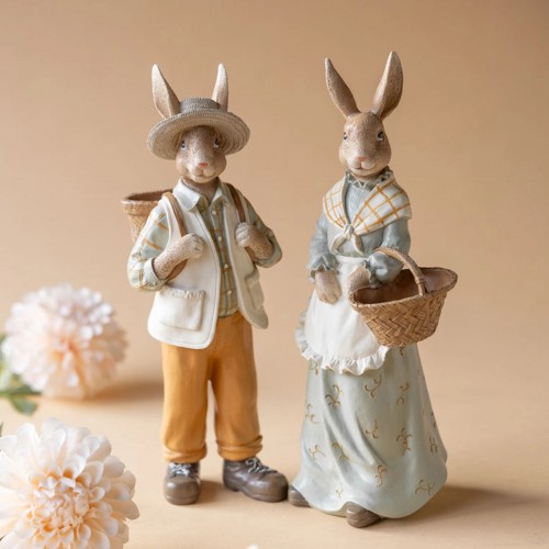 Papuoškite savo namus švelnumu ir pavasariška nuotaika su šiomis nepaprastai mielomis dekoracijomis! Miela zuikučių pora, pasiruošusi išvykai. Puikiai tiks dekoruoti kavos staliuką ar šventinį stalą, suteikdama namams žaismingos nuotaikos.