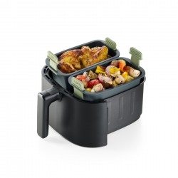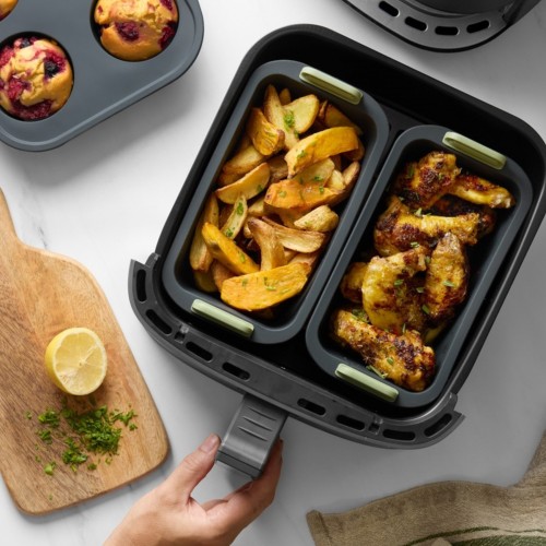 Lanksti ir patogi kepimo forma, skirta gaminti įvairius patiekalus oro gruzdintuvėje – nuo daržovių iki vištienos ar kepinių. Stačiakampė forma leidžia optimaliai išnaudoti kepimo vietą, o aukštos kokybės silikonas užtikrina tolygų kaitinimą ir lengvą valymą. Naudodami šias formas galite patogiai atskirti vienu metu kepamus patiekalus, todėl toje pačioje oro gruzdintuvėje galima ruošti skirtingus patiekalus vienu metu. Patogios šoninės rankenėlės neįkaista, todėl karštus patiekalus galite išimti saugiai ir be vargo.