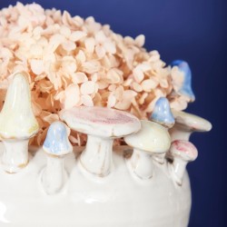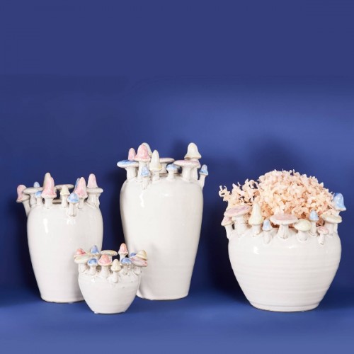 Ši Wener Voss Mushrooms keraminė vaza išsiskiria išraiškingu dizainu. Dekoratyviniai grybų akcentai, tarsi išdygę aplink vazos viršų, suteikia jai žaismingo ir išskirtinumo. Pasteliniai mėlyni, gelsvi ir rusvi tonai pripildo kompoziciją šilumos ir romantiškos nuotaikos, todėl ši vaza puikiai tiks tiek svetainėje, tiek miegamajame ar prieškambaryje.