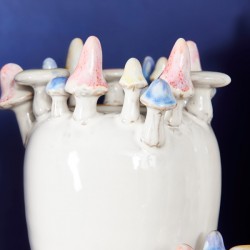 Ši Wener Voss Mushrooms keraminė vaza išsiskiria išraiškingu dizainu. Dekoratyviniai grybų akcentai, tarsi išdygę aplink vazos viršų, suteikia jai žaismingo ir išskirtinumo. Pasteliniai mėlyni, gelsvi ir rusvi tonai pripildo kompoziciją šilumos ir romantiškos nuotaikos, todėl ši vaza puikiai tiks tiek svetainėje, tiek miegamajame ar prieškambaryje.