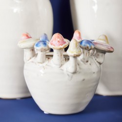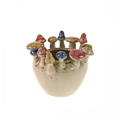 Ši Wener Voss Mushrooms keraminė vaza išsiskiria išraiškingu dizainu. Dekoratyviniai grybų akcentai, tarsi išdygę aplink vazos viršų, suteikia jai žaismingo ir išskirtinumo. Pasteliniai mėlyni, gelsvi ir rusvi tonai pripildo kompoziciją šilumos ir romantiškos nuotaikos, todėl ši vaza puikiai tiks tiek svetainėje, tiek miegamajame ar prieškambaryje.