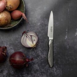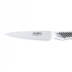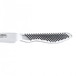 Global GS-38 – kompaktiškas ir elegantiškas skutimo peilis, skirtas tiksliems, smulkiems darbams virtuvėje. Ergonomiška rankena patogiai priglunda prie delno, todėl peilį lengva valdyti. Puikiai tinka vaisių ir daržovių lupimui ir pjaustymui.