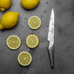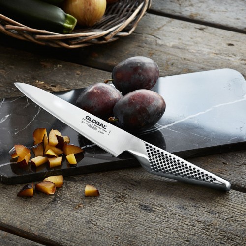 Global GS-11 peilis – vienas populiariausių GLOBAL peilių asortimente, dažnai įtraukiamas į peilių rinkinius kaip universalus pagalbininkas virtuvėje. 11 cm ilgio vidutinio dydžio, lanksti geležtė idealiai tinka mažų žuvų filetavimui, taip pat gali būti naudojama kaip kompaktiškas skutimo peilis.